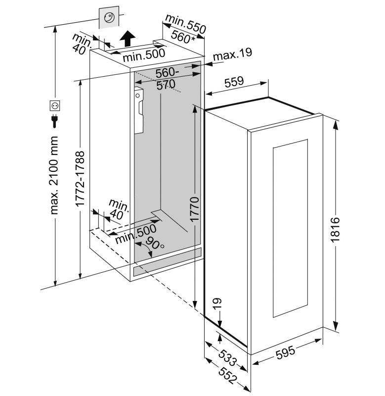 - Розміри ніші для вбудовування: 178 x 56 x 55 см ,