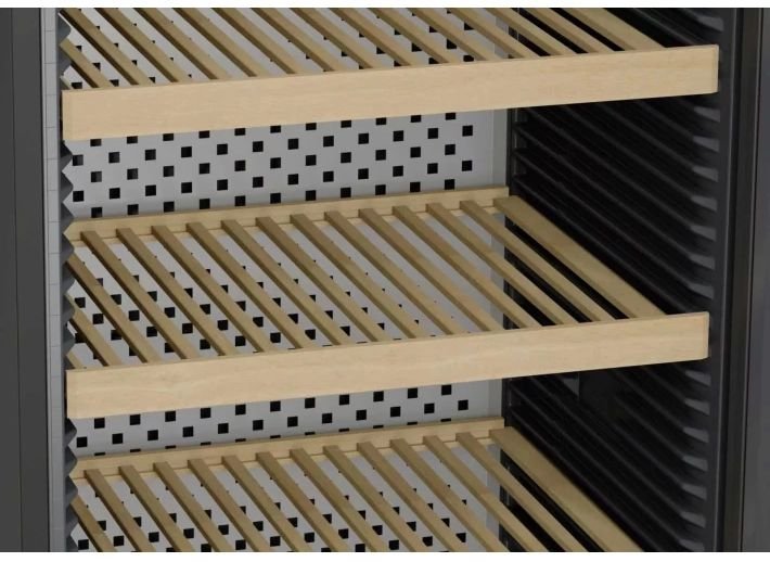Витримка та стиль. Витончені полиці з бука призначені для горизонтального зберігання вин при низькій вібрації, а їхня ергономічна форма дозволяє легко розміщувати, виймати та перекладати пляшки. Ще одна перевага – здатність деревини дихати та утримувати невелику кількість води, що підтримує внутрішній мікроклімат, а також сприяє тривалому зберіганню.