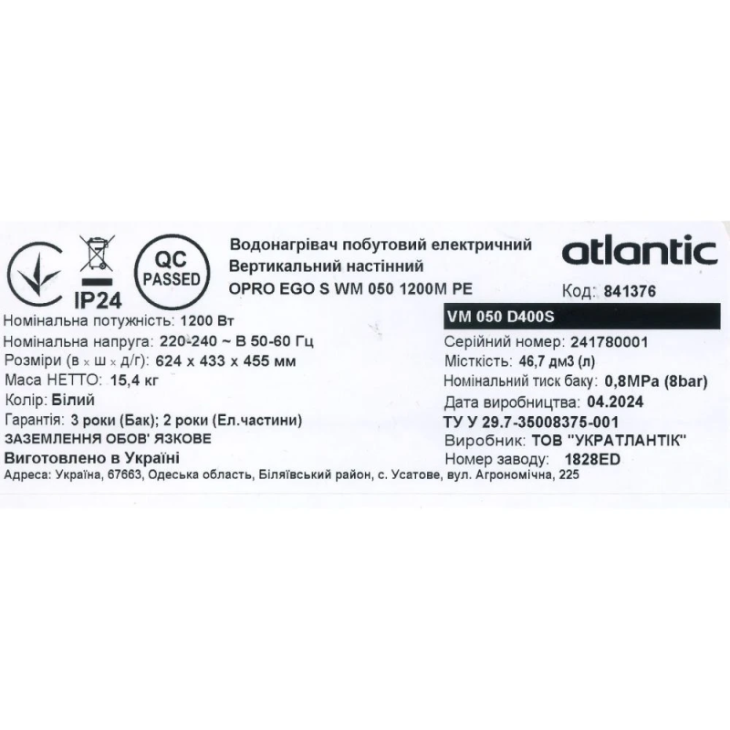 Atlantic Opro Ego VM 050 D400S (1200W) — это надёжный выбор для тех, кто ценит качество, безопасность и экономичность. Компания Atlantic предоставляет гарантию на бак сроком 3 года и на электрический блок — 2 года.