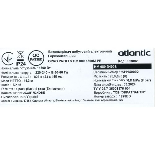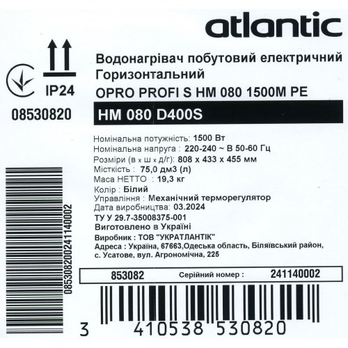 Характеристики Бойлер Atlantic OPro Horizontal HM 080 D400S