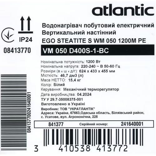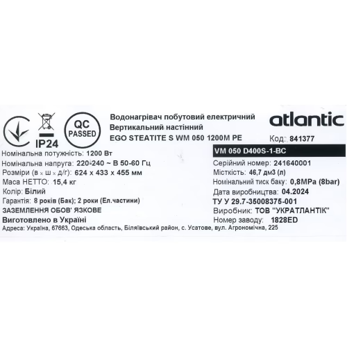 Atlantic Steatite Ego VM 050 D400S-1-BC 1200W — это идеальный выбор для тех, кто ценит долговечность и современный дизайн. Высокое качество и надежность подтверждаются гарантией от Atlantic: 8 лет на бак и 2 года на электрическую часть.