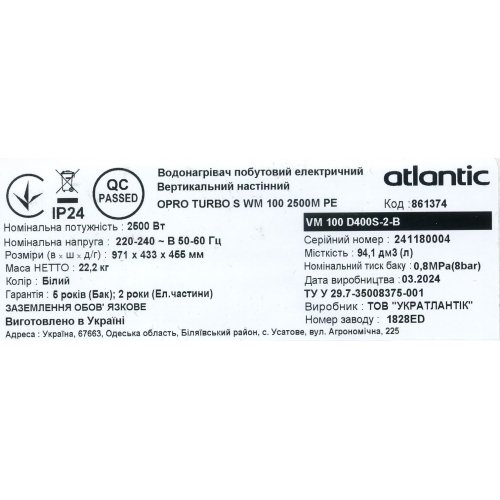 Atlantic гарантирует высокое качество своей продукции, предоставляя гарантийные обязательства на рабочий бак серии OPro Turbo в течение 5 лет и на электрическую часть – на протяжении 2 лет.