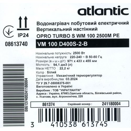 Характеристики Бойлер Atlantic Turbo VM 100 D400S-2-B 2500W