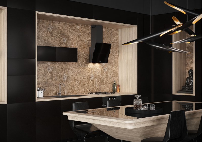 Вытяжка Versus с наклонной панелью из стекла в черном или белом исполнении украсит любой интерьер и будет органично сочетаться с любыми фактурами.
