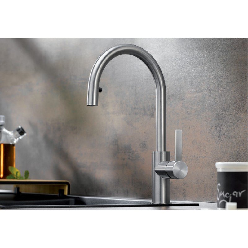 - Безупречная конструкция из нержавеющей стали, матовая Прямолинейный дизайн для лаконичной кухни Высокий изогнутый излив для легкого наполнения кастрюл