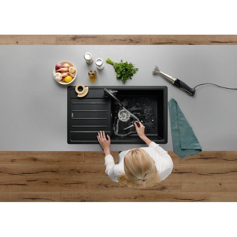 Однорычажный смеситель Blanco MIDA-S (526653) черный матовый — изысканный и лаконичный дизайн дополнен элегантным регулятором для компактных моек. Модель имеет выдвижной излив для комфортного наполнения емкостей или ополаскивания посуды. Также излив может поворачиваться на 360°, что позволяет быстро очистить крыло или надежно сложить большую посуду в мойке. Стабилизирующая пластина создает дополнительную стойкость смесителя и защищает от образования подтеков.