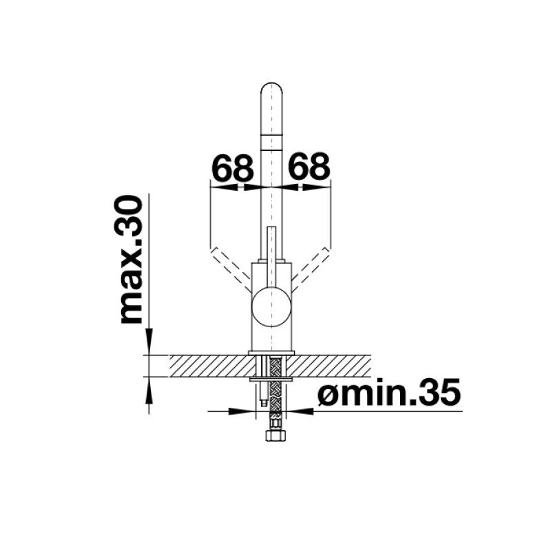 - Легкое подключение гибкими шлангами длиной 350 мм с гайкой ⅜'' ,
