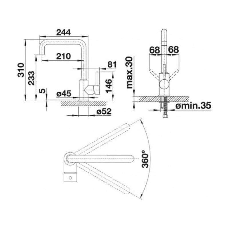 - Увеличенный радиус действия благодаря изливу, вращающемуся на 360°