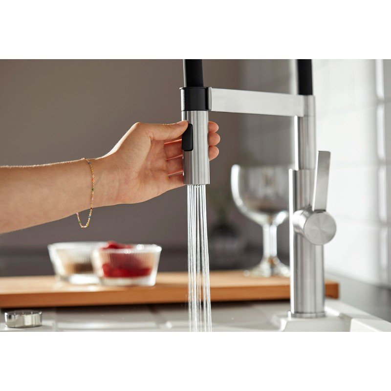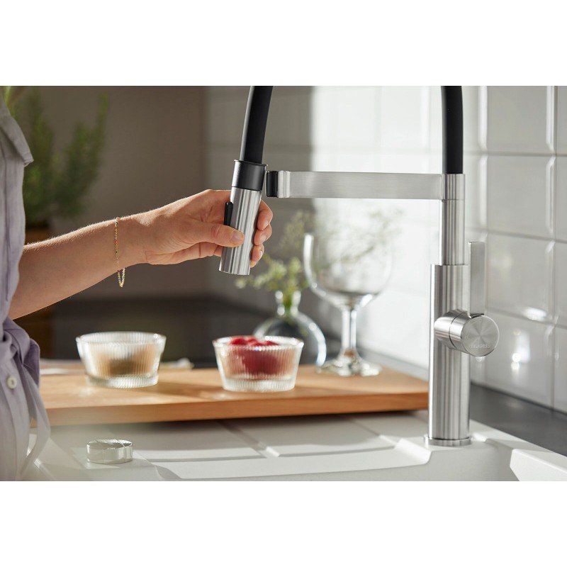 Смеситель Blanco SONEA-S Flexo (526616) нержавеющая сталь/чёрный — мастер контраста: гибкий полупрофессиональный шланг из чёрной резины подчеркивает тонкий блеск крепкой нержавеющей стали, обеспечивая при этом оптимальный диапазон движения. Точный магнитный держатель для крепления шланга придает удобства. А простое переключение между аэрированной струей и мощным душем для ополаскивания с помощью двойного излива делает этот смеситель идеальным вариантом для тех, кто хочет переключаться между деликатным режимом для приготовления блюд и режимом для чистки и ополаскивания, с большим напором воды.