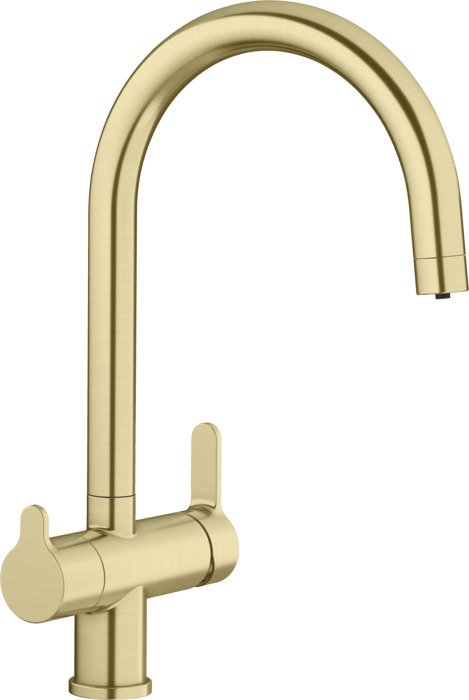 Blanco TRIMA золотой сатин 526695 — современный кухонный смеситель с функцией подключения фильтра. Особенностью данной модели является возможность подвода дополнительного шланга с питьевой фильтрованной водой. Для регулирования подачи фильтрованной и нефильтрованной воды служат два отдельных рычага. Подача воды осуществляется с помощью одного совмещенного излива с разделённым рассекателем, что экономит место за мойкой и является современным решением подачи питьевой воды.