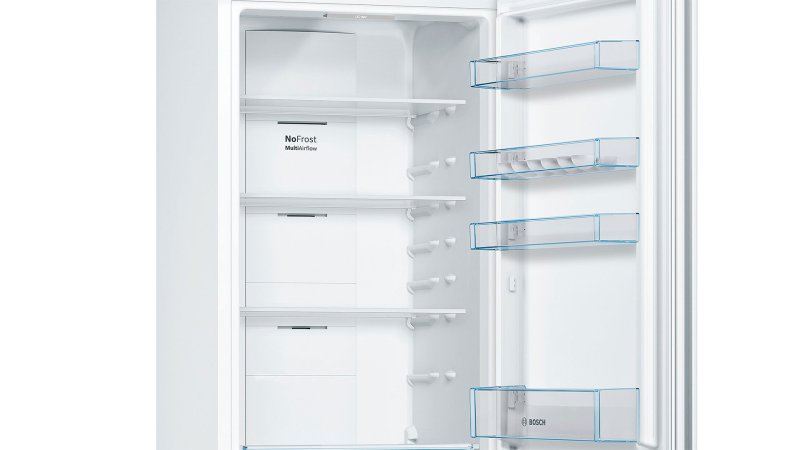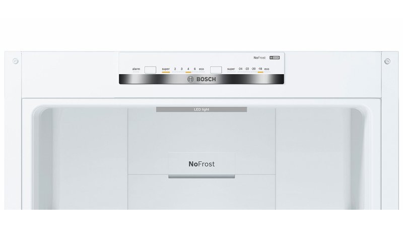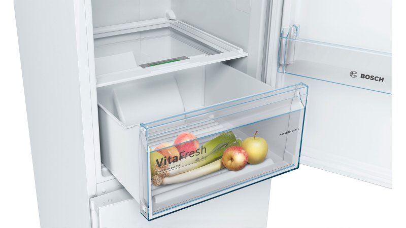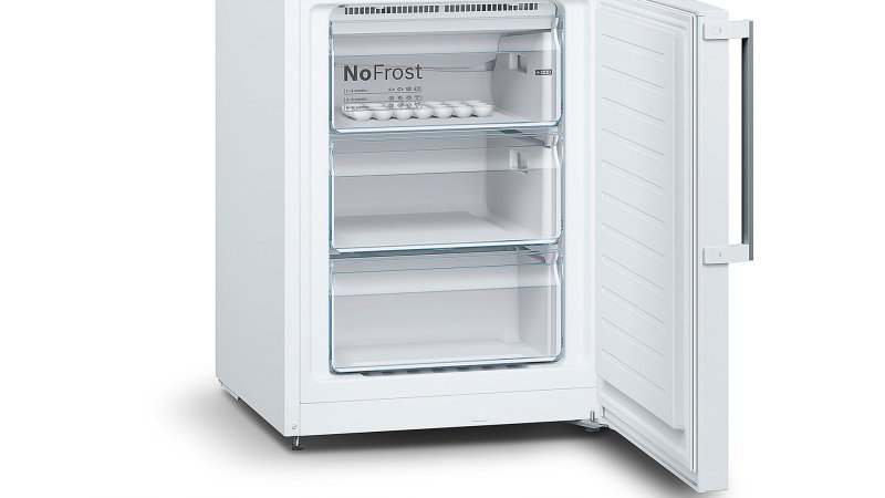 Холодильник с нижней морозильной камерой KGN39UW306. В этом холодильнике холодильное отделение находится прямо напротив вас, на уровне груди. В нижней части располагается просторная морозильная камера. Поскольку перегородка делит холодильник пополам, вам не придется наклоняться, чтобы достать продукты из холодильного отделения. Забудьте про разморозку холодильника. Благодаря нашим холодильникам с системой NoFrost вы сможете навсегда забыть про разморозку. В отличие от обычных холодильников содержащаяся в воздухе влага у холодильника NoFrost постоянно накапливается в центральном охладителе, который автоматически размораживается через определенные интервалы времени. Образующийся конденсат выводится из холодильника через трубку наружу в поддон, где затем испаряется. Таким образом, система NoFrost защищает холодильник не только от обледенения, но и избавляет от необходимости размораживать его вручную. Свежесть с верхней до нижней полки: Multi Airflow. Размещение продуктов в холодильнике может вызвать сложности: в некоторых отделениях они остаются свежими, в других – высыхают. Система MultiAirflow с вентилятором усиливает циркуляцию воздуха внутри холодильника и поддерживает равномерную температуру и влажность сверху донизу. Колебания температуры минимальны, сокращается время охлаждения – это помогает сохранить свежесть и вкус продуктов дольше. Защищает замороженные продукты от размораживания: функция SuperFreezing. Функция SuperFreezing обеспечивает быстрое замораживание новых продуктов, предотвращая размораживание содержимого морозильной камеры. В результате замороженные продукты сохраняют свой вкус даже при добавлении новых продуктов. FreshSense: климат контроль Вашего холодильника. Постоянная температура в холодильние - решающий фактор в достижении длительного срока хранения продуктов. Датчики FreshSense постоянно контролируют и поддерживают температуру в холодильном и морозильном отделениях. Полки из безопасного стекла SafetyGlass. Очень надежные и удобные полочки сделаны из прочного и легкого в чистке стекла. Также преимуществом таких полок является то, что при падении они не разлетаются на осколки, поэтому обеспечивают максимальную безопасность. Продукты в ярком свете: LED-освещение. Холодильники Bosch VitaFresh оснащены ярким и равномерным светодиодным освещением холодильной камеры. Боковой и потолочный источники света расположены таким образом, что не перекрываются продуктами, поэтому содержимое полок и зоны свежести отлично просматривается. Надёжный заслон тёплому воздуху: SuperCooling. При открывании холодильника проникает тёплый воздух, способный испортить находящиеся внутри продукты. Для их защиты активизируется функция SuperCooling и температура в холодильнике быстро понижается нажатием кнопки (не ниже 2 °C). Чтобы избежать лишних затрат электроэнергии, эта функция автоматически выключается примерно через шесть часов. Функция Supercooling сохраняет свежесть старых и новых продуктов с помощью разумного прогнозирования. Пусть ваш холодильник пахнет свежестью: AirFresh Filter. Фильтр Airfresh с антибактериальной защитой antiBacteria активно нейтрализует запахи внутри холодильника и отфильтровывает бактерии. Он встроен в систему вентиляции и препятствует смешиванию запахов, чтобы продукты сохраняли свой естественный вкус. Этот фильтр обеспечивает постоянную свежест