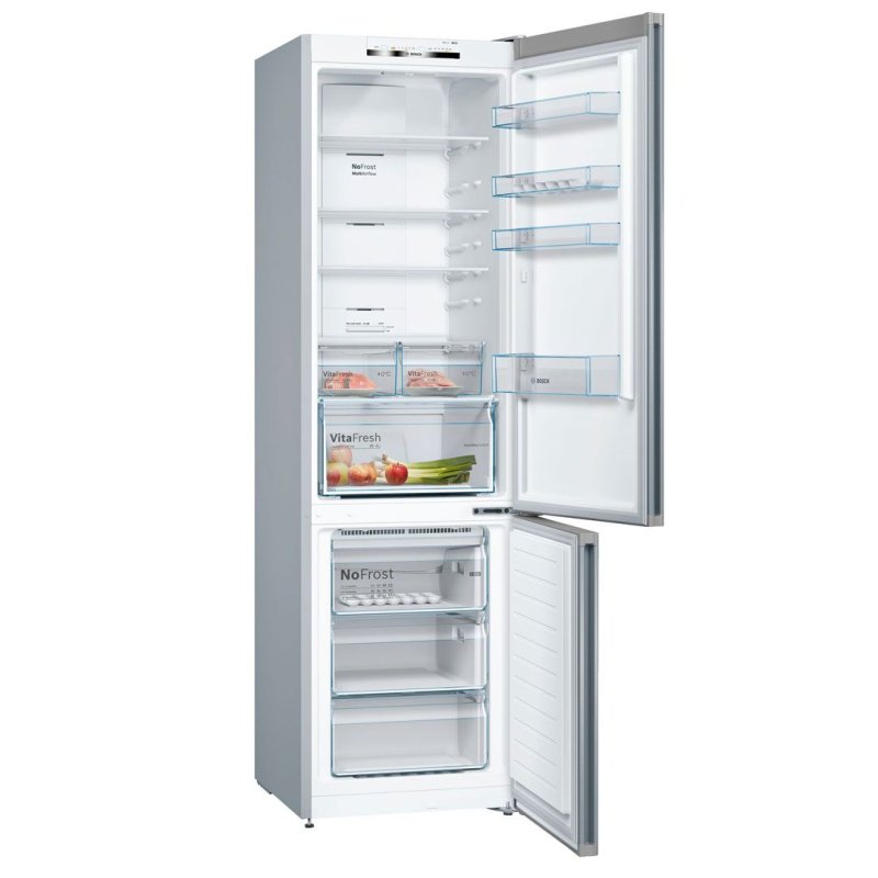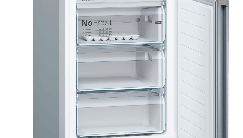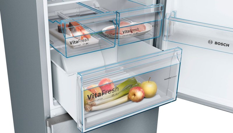 Система сохранения свежести VitaFresh plus обеспечивает идеальные условия для хранения рыбы, мяса, овощей и фруктов, сохраняя их свежими вдвое дольше. Непревзойденный дизайн и современные технологии. Мечтаете об идеальном холодильнике из нержавеющей стали? Inox Look воплотит Ваши желания. Забудьте о разморозке холодильника. Благодаря нашим холодильникам с системой NoFrost вы сможете навсегда забыть про разморозку. В отличие от обычных холодильников содержащаяся в воздухе влага у холодильника NoFrost постоянно накапливается в центральном охладителе, который автоматически размораживается через определенные интервалы времени. Образующийся конденсат выводится из холодильника через трубку наружу в поддон, где затем испаряется. Таким образом, система NoFrost защищает холодильник не только от обледенения, но и избавляет от необходимости размораживать его вручную. Надёжный заслон тёплому воздуху: SuperCooling. При открывании холодильника проникает тёплый воздух, способный испортить находящиеся внутри продукты. Для их защиты активизируется функция SuperCooling и температура в холодильнике быстро понижается нажатием кнопки (не ниже 2 °C). Чтобы избежать лишних затрат электроэнергии, эта функция автоматически выключается примерно через шесть часов. Функция Supercooling сохраняет свежесть старых и новых продуктов с помощью разумного прогнозирования. Сохраняет продукты свежими в 2 раза дольше. Холодильники Bosch с технологией VitaFresh сохраняют свежесть продуктов до 2-х раз дольше, поддерживая оптимальную температуру и уровень влажности.* В ящиках для мяса и рыбы поддерживается особый температурный режим (около 0 градусов) для более длительного сохранения свежести продуктов без заморозки. В ящике для овощей и фруктов поддерживается стабильная температура и естественный уровень влажности благодаря возможности регулировать доступ сухого воздуха, который сохраняет свежесть продуктов и их витамины. Свежесть с верхней до нижней полки: Multi Airflow. Размещение продуктов в холодильнике может вызвать сложности: в некоторых отделениях они остаются свежими, в других – высыхают. Система MultiAirflow с вентилятором усиливает циркуляцию воздуха внутри холодильника и поддерживает равномерную температуру и влажность сверху донизу. Колебания температуры минимальны, сокращается время охлаждения – это помогает сохранить свежесть и вкус продуктов дольше. Пусть ваш холодильник пахнет свежестью: AirFresh Filter. Фильтр Airfresh с антибактериальной защитой antiBacteria активно нейтрализует запахи внутри холодильника и отфильтровывает бактерии. Он встроен в систему вентиляции и препятствует смешиванию запахов, чтобы продукты сохраняли свой естественный вкус. Этот фильтр обеспечивает постоянную свежесть в течение всего срока службы холодильника. Больше комфорта в Вашем холодильнике. Специальная подвесная металлическая хромированная решетка предназначена для хранения двух бутылок значительно сэкономит место в вашем холодильнуку. А технология EasyAccess поможет с легкостью доставать и переставлять полки на любой уровень. Полки из безопасного стекла SafetyGlass. Очень надежные и удобные полочки сделаны из прочного и легкого в чистке стекла. Также преимуществом таких полок является то, что при падении они не разлетаются на осколки, поэтому обеспечивают максимальную безопасность. FreshSense: климат контроль 