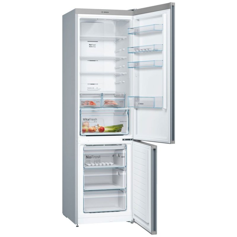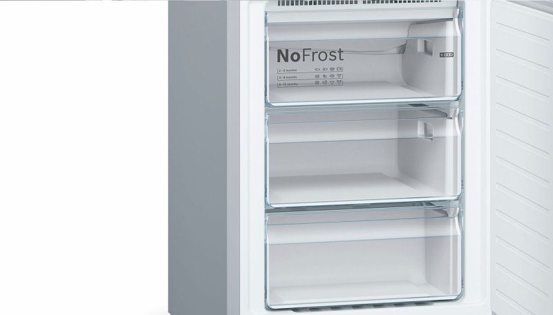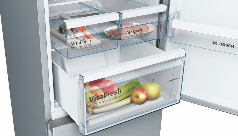 Система сохранения свежести VitaFresh plus обеспечивает идеальные условия для хранения рыбы, мяса, овощей и фруктов, сохраняя их свежими вдвое дольше. Непревзойденный дизайн и современные технологии. Мечтаете об идеальном холодильнике из нержавеющей стали? Inox Look воплотит Ваши желания. Забудьте о разморозке холодильника. Благодаря нашим холодильникам с системой NoFrost вы сможете навсегда забыть про разморозку. В отличие от обычных холодильников содержащаяся в воздухе влага у холодильника NoFrost постоянно накапливается в центральном охладителе, который автоматически размораживается через определенные интервалы времени. Образующийся конденсат выводится из холодильника через трубку наружу в поддон, где затем испаряется. Таким образом, система NoFrost защищает холодильник не только от обледенения, но и избавляет от необходимости размораживать его вручную. Надёжный заслон тёплому воздуху: SuperCooling. При открывании холодильника проникает тёплый воздух, способный испортить находящиеся внутри продукты. Для их защиты активизируется функция SuperCooling и температура в холодильнике быстро понижается нажатием кнопки (не ниже 2 °C). Чтобы избежать лишних затрат электроэнергии, эта функция автоматически выключается примерно через шесть часов. Функция Supercooling сохраняет свежесть старых и новых продуктов с помощью разумного прогнозирования. Сохраняет продукты свежими в 2 раза дольше. Холодильники Bosch с технологией VitaFresh сохраняют свежесть продуктов до 2-х раз дольше, поддерживая оптимальную температуру и уровень влажности.* В ящиках для мяса и рыбы поддерживается особый температурный режим (около 0 градусов) для более длительного сохранения свежести продуктов без заморозки. В ящике для овощей и фруктов поддерживается стабильная температура и естественный уровень влажности благодаря возможности регулировать доступ сухого воздуха, который сохраняет свежесть продуктов и их витамины. Свежесть с верхней до нижней полки: Multi Airflow. Размещение продуктов в холодильнике может вызвать сложности: в некоторых отделениях они остаются свежими, в других – высыхают. Система MultiAirflow с вентилятором усиливает циркуляцию воздуха внутри холодильника и поддерживает равномерную температуру и влажность сверху донизу. Колебания температуры минимальны, сокращается время охлаждения – это помогает сохранить свежесть и вкус продуктов дольше. Пусть ваш холодильник пахнет свежестью: AirFresh Filter. Фильтр Airfresh с антибактериальной защитой antiBacteria активно нейтрализует запахи внутри холодильника и отфильтровывает бактерии. Он встроен в систему вентиляции и препятствует смешиванию запахов, чтобы продукты сохраняли свой естественный вкус. Этот фильтр обеспечивает постоянную свежесть в течение всего срока службы холодильника. Больше комфорта в Вашем холодильнике. Специальная подвесная металлическая хромированная решетка предназначена для хранения любых бутылок значительно сэкономит место в вашем холодильнуку. А технология EasyAccess поможет с легкостью доставать и переставлять полки на любой уровень Полки из безопасного стекла SafetyGlass. Очень надежные и удобные полочки сделаны из прочного и легкого в чистке стекла. Также преимуществом таких полок является то, что при падении они не разлетаются на осколки, поэтому обеспечивают максимальную безопасность. FreshSense: климат контроль 