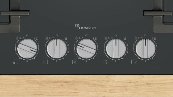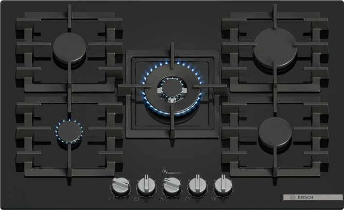 Serie | 6 Газовая варочная панель Bosch PPQ7A6I45 шириной 75 см из закаленного стекла с технологией FlameSelect: идеальные кулинарные результаты благодаря девяти точным ступеням мощности пламени.