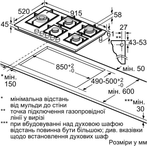 Ширина поверхности – 91,5 см, глубина – 52 см. Габариты для встраивания: 4,5 х 85 х 49-50 см. Высота конструкции – 5,4 см. Вес устройства – 23,4 кг, а в упаковке – 26,8 кг. Присоединительная мощность газа – 12,5 кВт. Длина шнура питания – 100 см (вилка в комплект не входит – необходимо подключение специалистом).
