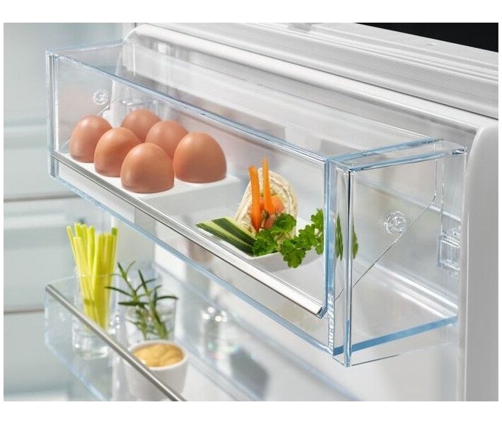 Холодильник-морозильник 600 TwinTech® сохраняет сочность продуктов на 60% лучше, чем холодильники с одним испарителем. Сдвоенная система охлаждения поддерживает идеальный уровень влажности и защищает продукты от потери влаги. Кроме того, вам больше не придется размораживать морозильную камеру. Благодаря технологии TwinTech продукты остаются на 60 % более сочными. Умное двойное охлаждение TwinTech® No Frost защитит продукты от потери влаги. Раздельное охлаждение холодильной и морозильной камер превосходит стандартные системы No Frost. Забудьте про наледь в морозильной камере! C TwinTech® No Frost продукты в холодильной камере будут «усыхать» на 60% меньше. По результатам внутреннего испытания с измерением уровня влажности по истечении 9 дней хранения продуктов в сравнении с собственным прибором с одним испарителем. MultiSpace: абсолютная гибкость хранения