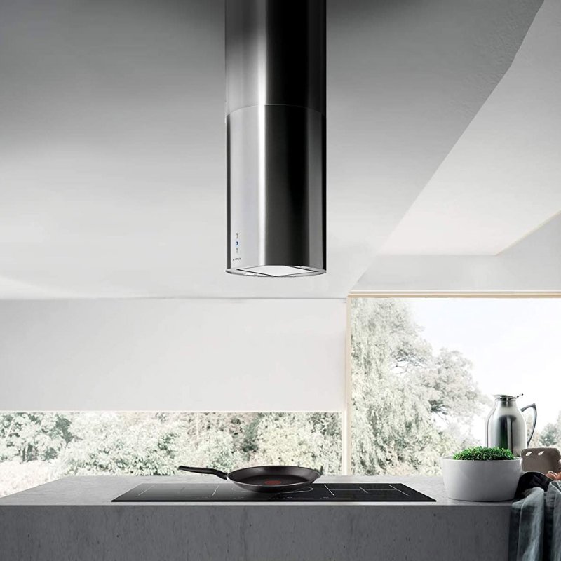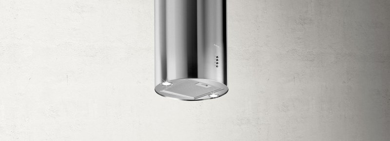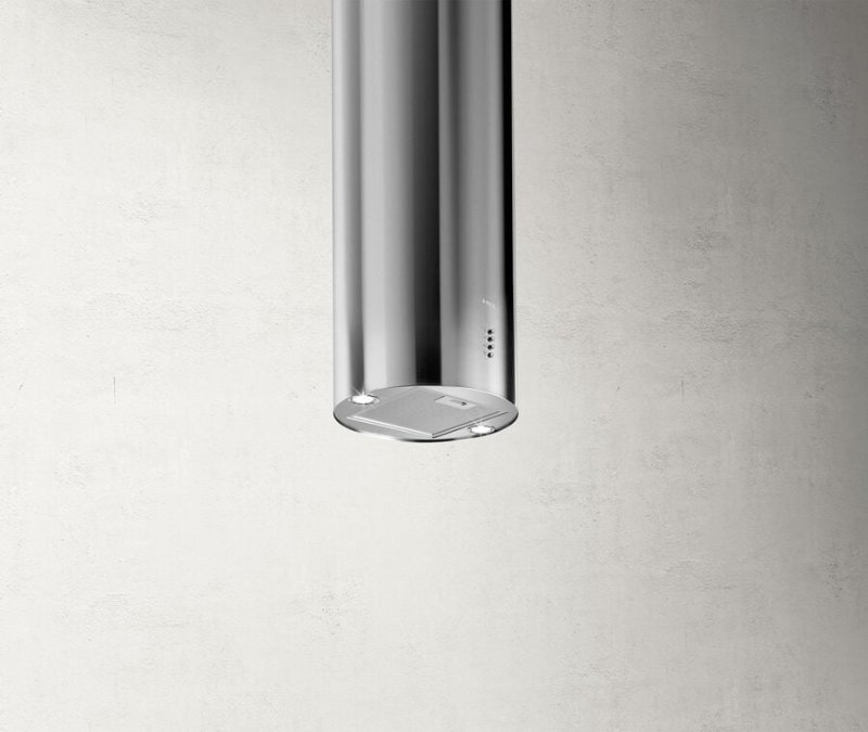 Вытяжка островного типа Elica TUBE PRO ISLAND IX/A/43 выполнена в нестандартном исполнении в цвете нержавеющей стали. Она представляет собой трубу, спускающуюся с потолка. Прямо на нижней части трубы расположены элементы управления и освещение. Там же есть и фильтр.