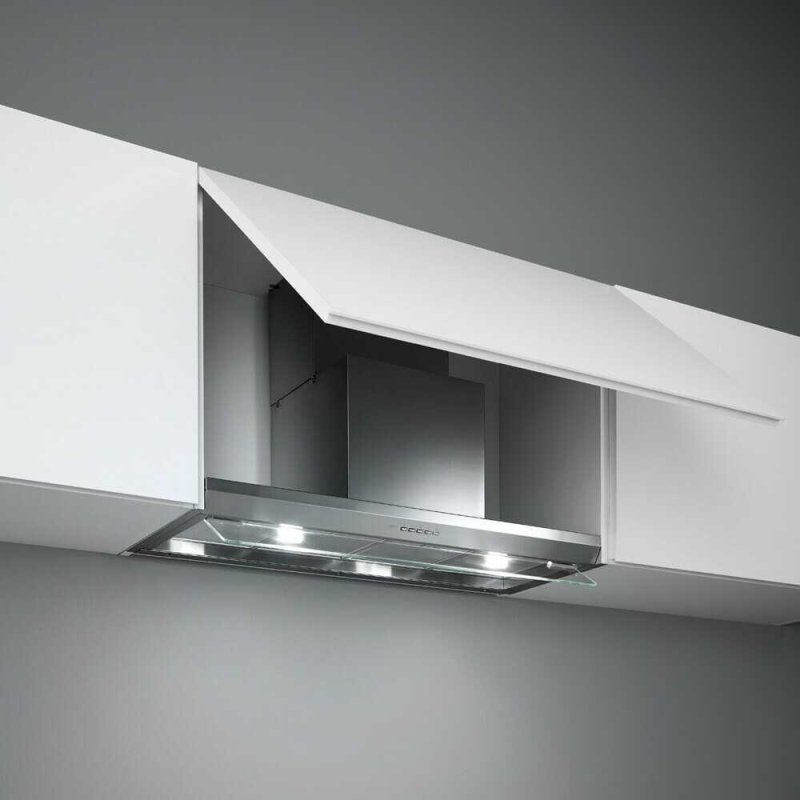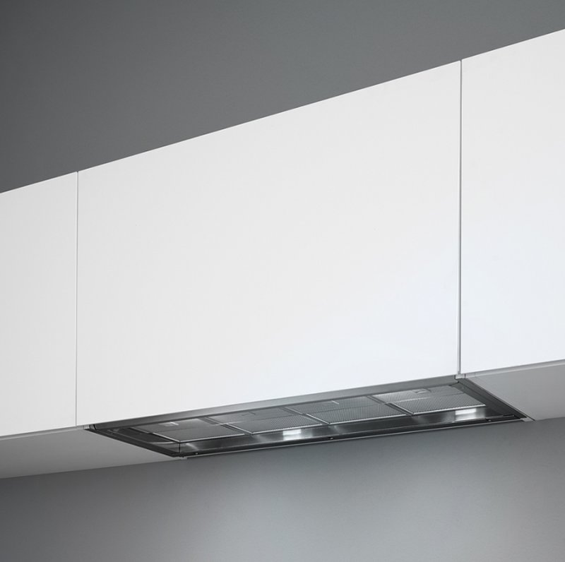 Встроенные вытяжки, размещенные внутри кухонных шкафов, гарантируют непрерывность линий всей установленной мебели и максимизируют доступное рабочее пространство за счет скрытия всех лишних элементов. Такой тип установки рекомендован в минималистичном дизайне, чтобы максимально использовать все полезное пространство.