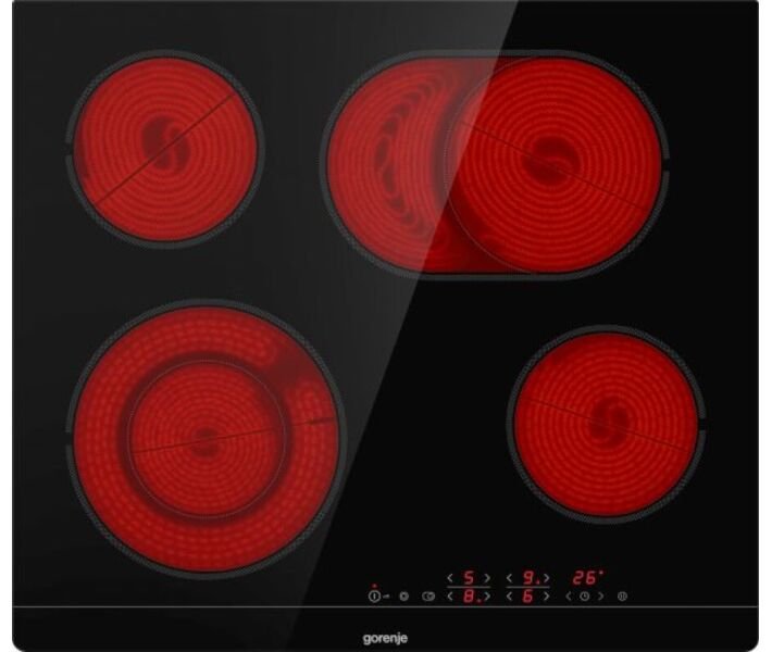 Независимая стеклокерамическая варочная поверхность Gorenje ECT643BSC для безопасной эксплуатации оборудована индикатором остаточного тепла. Световой индикатор будет активным, пока поверхность горячая. Преимущество данной функции в том, что остаточное тепло можно применить для размораживания или поддержания блюд в теплом состоянии. При этом не тратя электроэнергию. Параметры конфорок