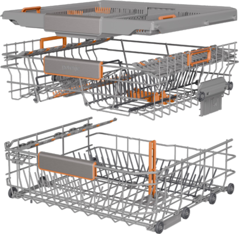 - Нижняя корзина: крупная сетка корзины; ручка с логотипом из нержавеющей стали; складные/раздельные задние держатели тарелок ,