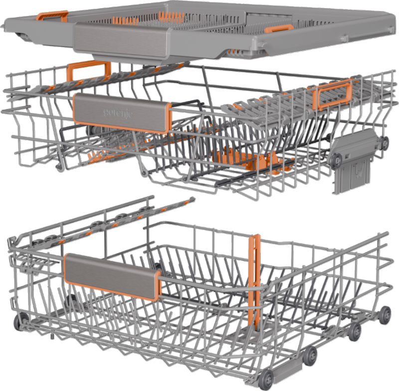 - Нижняя корзина: крупная сетка корзины; ручка с логотипом из нержавеющей стали; складные/раздельные задние держатели тарелок ,