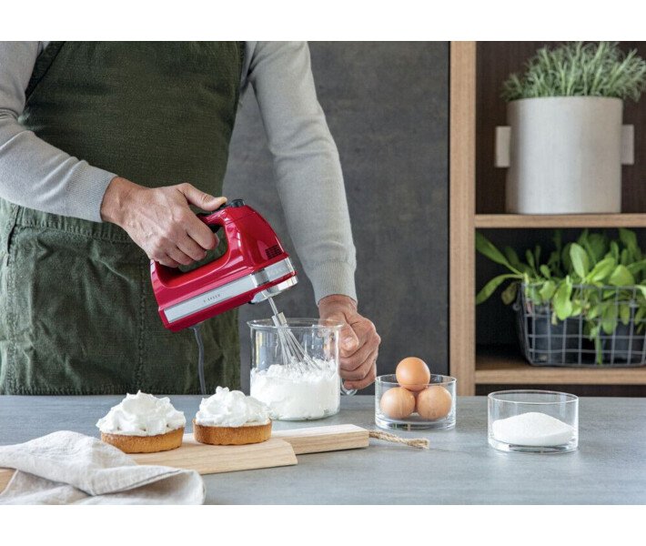 Положитесь на компактные размеры и получите превосходные результаты. Делайте любую еду кулинарным шедевром с помощью 9-скоростного цифрового ручного миксера KitchenAid. Диапазон из девяти скоростей расширяет ваши творческие возможности: низкие скорости идеальны для помешивания деликатных соусов или молочных коктейлей безо всякого разбрызгивания. На более высоких скоростях можно замешивать густое тесто. А самые большие скорости подходят для идеального взбивания яичных белков. Цифровой ручной миксер – младший брат классического настольного миксера KitchenAid, особенно подходящий для деятельных поваров или тех кулинаров, у кого весьма ограничено пространство столешницы. Положитесь на компактные размеры и получите превосходные результаты: от восхитительных дежурных блюд до утонченных яств на выходные. Вы также можете положиться на неизменное высокое качество техники KitchenAid. Сделанный в США, надежный электродвигатель постоянного тока (85 Вт) сочетается с цифровым светодиодным дисплеем, обеспечивая точность и мощность. Поддержка всего диапазона аксессуаров означает, что вам по плечу любые рецепты для выпечки и кондитерских изделий. Две турбовзбивалки из нержавеющей стали, входящие в стандартный комплект поставки, великолепно справляются с густыми смесями и большими объемами. Четыре следующих аксессуара включают в себя два крюка для замешивания теста, 16-проволочный венчик, стержневой смеситель и чехол из хлопка для хранения.