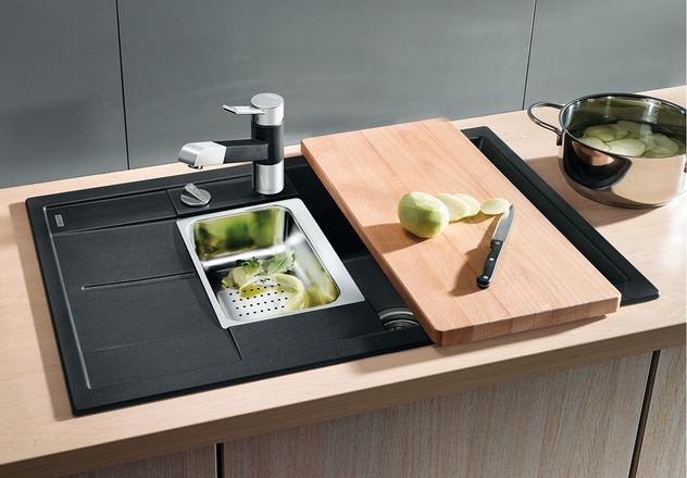 Кухонная мойка Blanco METRA 6 S Compact тёмная скала выполнена из искусственного камня SILGRANIT® высокого качества и подходит для установки в кухонный шкаф шириной 60 см. с монтажом под столешницу. Глубина основной чаши мойки составляет 19 см и 13 см дополнительной чаши. Модель METRA 6 S Compact тёмная скала 518876 производится на заводе Blanco в Германии и на нее распространяется официальная гарантия производителя в течение 5 лет. На нашем сайте вы можете купить мойку Blanco METRA 6 S Compact тёмная скала 518876 онлайн с доставкой по любому адресу в Украине Гранитные мойки производятся из материала Silgranit. Этот композитный материал имеет долю натурального гранита около 80%. Это видимо не только при взгляде, но и на ощупь. Мойки из материала Silgranit имеют приятную на ощупь структуру натурального камня и очень легки в уходе. Silgranit действует как защитная гигеническая формула, обеспечивающая очень легкий уход. Более того, материал отличается высокой стойкостью. На кухне вы хотите готовить из чего угодно, например томатов, клубники, лимонного сока или моркови. Ваша мойка останется невосприимчивой к тому, что вы готовите за ней и не допустит никаких отложений или обесцвечивания. Такое сочетание делает вашу мойку из материала Silgranit оптимальной с точки зрения функциональности и хорошего вида. Чистота линий – максимальный комфорт