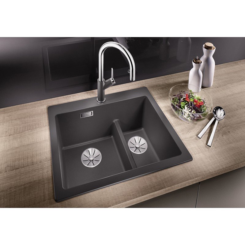 Кухонная мойка Blanco PLEON 6 Split антрацитиз искусственного камня SILGRANIT® высокого качества и подходит для установки в кухонный шкаф шириной 60 см. Накладная мойка с двумя чашами без сушки (крыла). Глубина чаши мойки составляет 22 см. Модель PLEON 6 Split антрацит 521689 производится на заводе Blanco в Германии и на нее распространяется официальная гарантия производителя в течение 5 лет. На нашем сайте вы можете купить мойку Blanco PLEON 6 Split антрацит 521689 онлайн с доставкой по любому адресу в Украине Гранитные мойки производятся из материала Silgranit. Этот композитный материал имеет долю натурального гранита около 80%. Это видимо не только при взгляде, но и на ощупь. Мойки из материала Silgranit имеют приятную на ощупь структуру натурального камня и очень легки в уходе. Silgranit действует как защитная гигеническая формула, обеспечивающая очень легкий уход. Более того, материал отличается высокой стойкостью. На кухне вы хотите готовить из чего угодно, например томатов, клубники, лимонного сока или моркови. Ваша мойка останется невосприимчивой к тому, что вы готовите за ней и не допустит никаких отложений или обесцвечивания. Такое сочетание делает вашу мойку из материала Silgranit оптимальной с точки зрения функциональности и хорошего вида. Чистая элегантность – большой объем отводная арматура InFino® с корзинчатым вентилем 3 ½“.