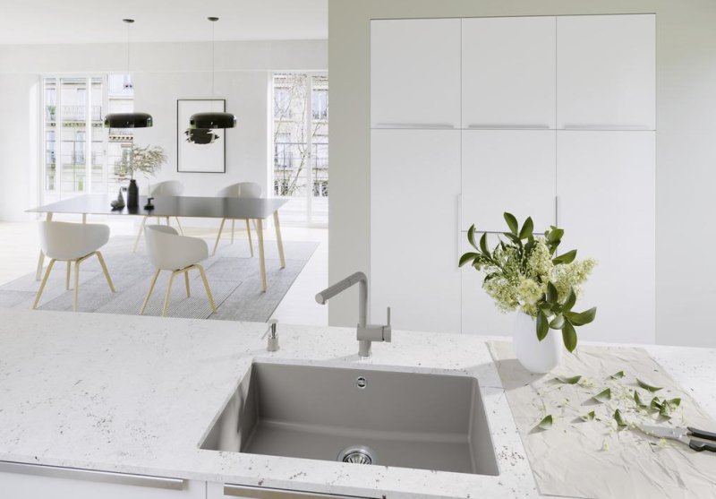 Кухонная мойка Blanco ROTAN 700-U кофеиз искусственного камня SILGRANIT® высокого качества и подходит для установки в кухонный шкаф шириной 80 см. Мойка с установкой под столешницу. Глубина чаши мойки составляет 19 см. Модель ROTAN 700-U кофе 521349 производится на заводе Blanco в Германии и на нее распространяется официальная гарантия производителя в течение 5 лет. На нашем сайте вы можете купить мойку Blanco ROTAN 700-U кофе 521349 онлайн с доставкой по любому адресу в Украине Гранитные мойки производятся из материала Silgranit. Этот композитный материал имеет долю натурального гранита около 80%. Это видимо не только при взгляде, но и на ощупь. Мойки из материала Silgranit имеют приятную на ощупь структуру натурального камня и очень легки в уходе. Silgranit действует как защитная гигеническая формула, обеспечивающая очень легкий уход. Более того, материал отличается высокой стойкостью. На кухне вы хотите готовить из чего угодно, например томатов, клубники, лимонного сока или моркови. Ваша мойка останется невосприимчивой к тому, что вы готовите за ней и не допустит никаких отложений или обесцвечивания. Такое сочетание делает вашу мойку из материала Silgranit оптимальной с точки зрения функциональности и хорошего вида. Современная линейка чаш для установки под столешницу отводная арматура с корзинчатым вентилем 3 ½“.