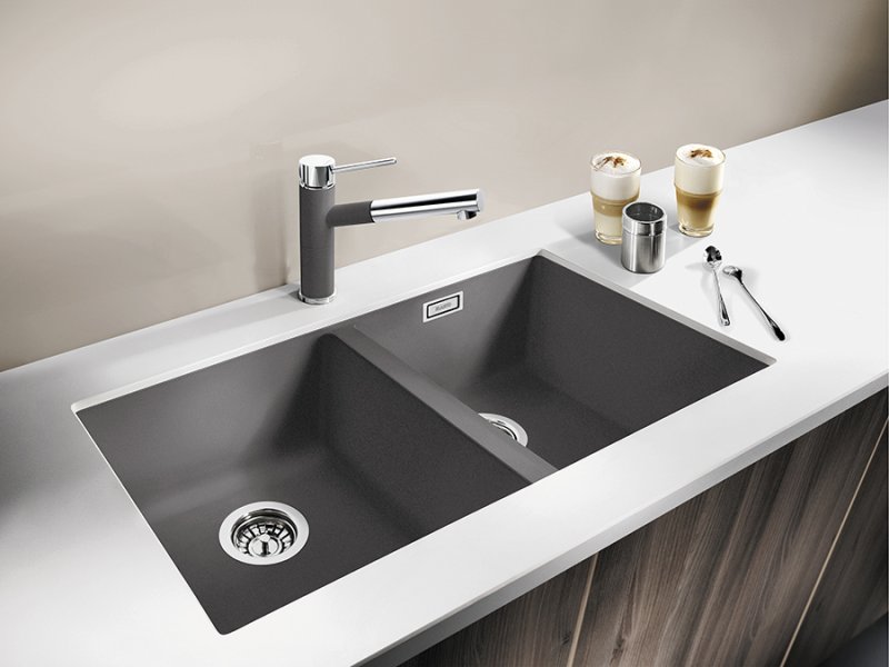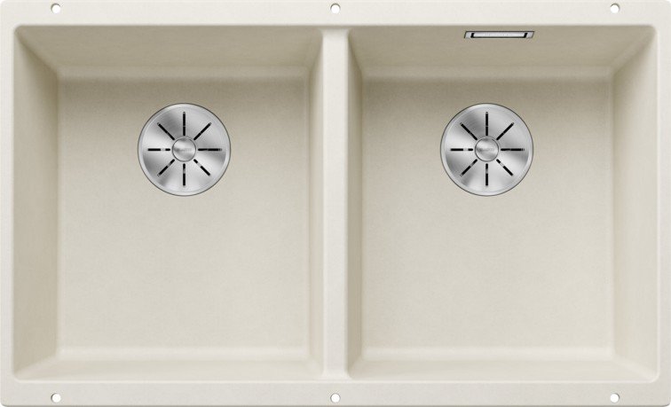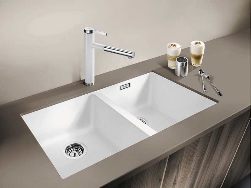 Кухонная мойка Blanco SUBLINE 350/350-U нежно белый из искусственного камня SILGRANIT® высокого качества и подходит для установки в кухонный шкаф шириной 80 см. Мойка с установкой под столешницу. Глубина чаши мойки составляет 20 см. Модель SUBLINE 350/350-U нежно белый 527164 производится на заводе Blanco в Германии и на нее распространяется официальная гарантия производителя в течение 5 лет. На нашем сайте вы можете купить мойку Blanco SUBLINE 350/350-U нежно белый 527164 онлайн с доставкой по любому адресу в Украине Гранитные мойки производятся из материала Silgranit. Этот композитный материал имеет долю натурального гранита около 80%. Это видимо не только при взгляде, но и на ощупь. Мойки из материала Silgranit имеют приятную на ощупь структуру натурального камня и очень легки в уходе. Silgranit действует как защитная гигеническая формула, обеспечивающая очень легкий уход. Более того, материал отличается высокой стойкостью. На кухне вы хотите готовить из чего угодно, например томатов, клубники, лимонного сока или моркови. Ваша мойка останется невосприимчивой к тому, что вы готовите за ней и не допустит никаких отложений или обесцвечивания. Такое сочетание делает вашу мойку из материала Silgranit оптимальной с точки зрения функциональности и хорошего вида. Дизайнерские мойки для монтажа под столешницу из материала SILGRANIT® PuraDur® отводная арматура InFino® с двумя корзинчатыми вентилями 3½“, набор крепежа