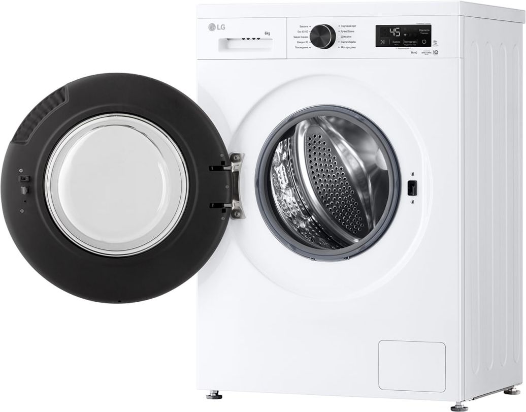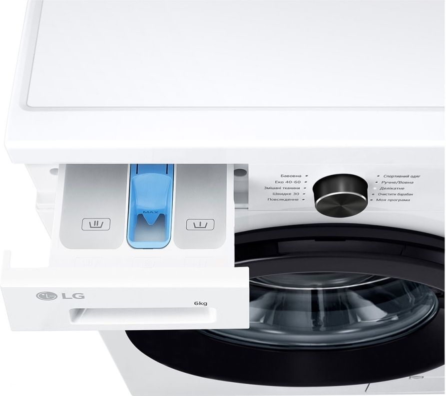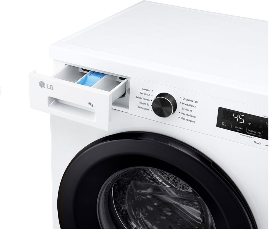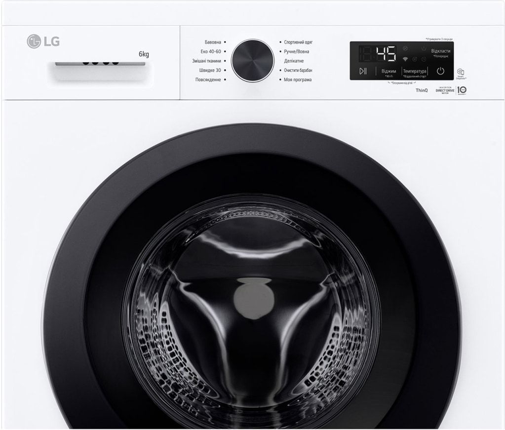 Доступны программы: Хлопок, ECO 40-60°C, Обработка паром, Деликатная, Шерсть/Ручная стирка, Спорт, Ежедневная, Быстро 30 мин, Смешанные/цветные ткани, а также Моя программа. LG Предусмотрены выбор температуры, скорости отжима, предварительная стирка и функция полоскания+.