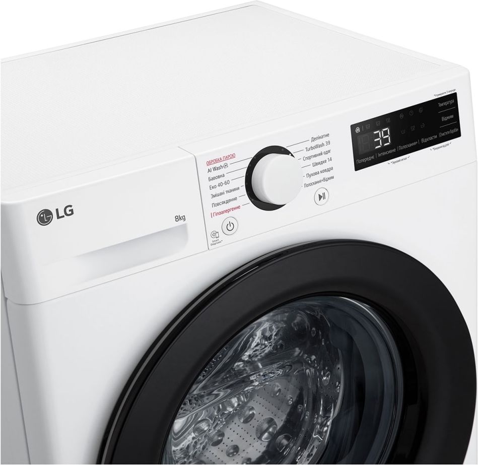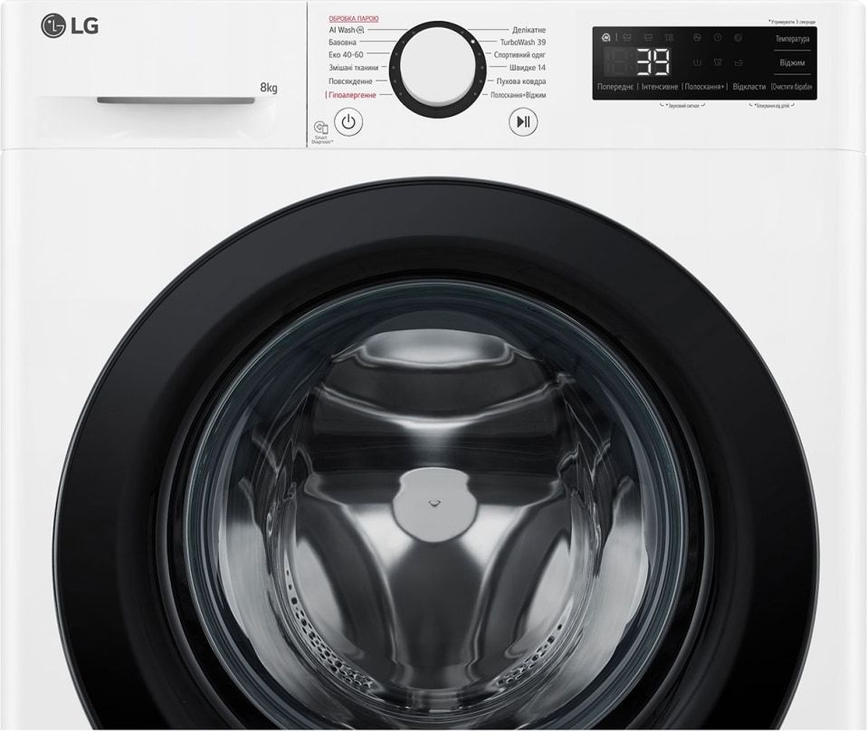 Машина поддерживает подключение по Wi-Fi и совместима с приложением LG ThinQ. Дистанционный запуск стирки, загрузка дополнительных программ, мониторинг расхода ресурсов и быстрая диагностика неисправностей через SmartDiagnosis — всё это доступно прямо со смартфона без необходимости вызова мастера.