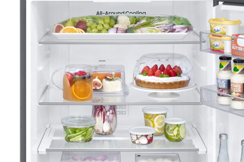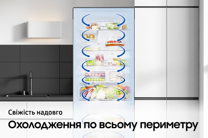 Гарантирует, что вся ваша еда должным образом охлаждена. Система всестороннего охлаждения равномерно охлаждает каждое отделение от угла к углу. Она постоянно проверяет температуру и обеспечивает циркуляцию холодного воздуха через оптимально расположенные вентиляционные отверстия. Благодаря этому, продукты сохраняются при оптимальной температуре и дольше остаются свежими. SmartThings Energy