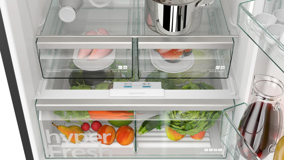 Вам больше никогда не придется размораживать морозильник и никаких капель воды на задней стенке холодильника. Благодаря технологии Total No Frost вам больше никогда не придется размораживать морозильник. Система удаляет влажность и поддерживает сухой воздух, предотвращая образование инея на стенках и продуктах. Это касается и холодильного отделения: забудьте о каплях воды и образовании льда на задней стенке, что гарантирует гигиенический вид. Это не только лишает вас хлопот с размораживанием и уборкой, но и делает ваш прибор более энергоэффективным.