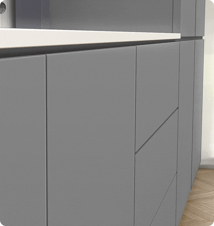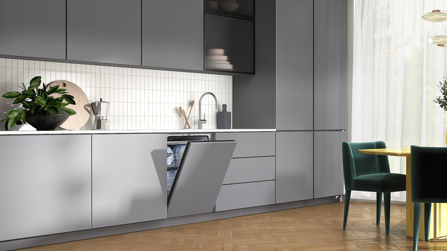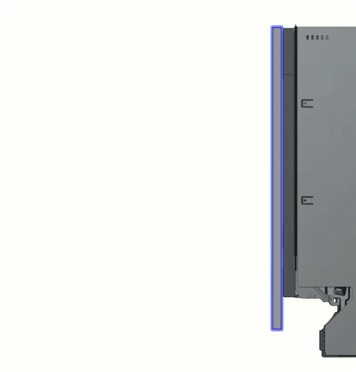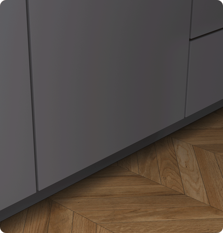 Обеспечьте идеальное сочетание посудомоечной машины с кухонным гарнитуром. Дверца Kitchen Fit™ оснащена скользящей крепью, которая обеспечивает смещение крышки дверцы вверх при открывании дверцы. Поэтому в отличие от неподвижных петель дверцу можно открывать полностью без необходимости подрезать плинтус внизу.