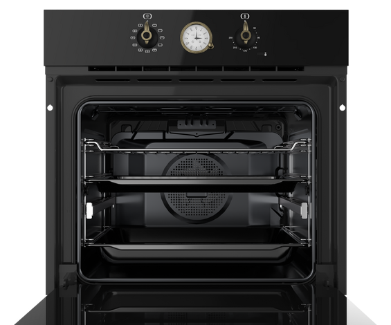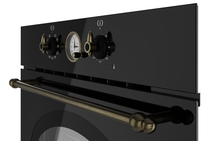Внутри за старинным фасадом скрывается вполне современный духовой шкаф. Teka HRB 6300 AT (111010010) представляет собой классическое 9-режимное решение, которое встречается в других моделях производителя. Большой выбор режимов работы обеспечивает достаточную степень свободы. Уникальный элемент, который несет не только декоративную функцию, - это аналоговый таймер со стрелками. Он обеспечивает не только сигнализацию, но и отключение нагрева. А в использовании такое устройство очень даже удобное!