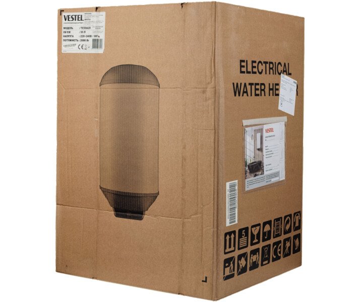 Настенный цилиндрический водонагреватель Vestel объемом 80 литров с легкостью обеспечит вас достаточным количеством горячей воды каждый день. Минималистичный дизайн данной модели позволит комфортно интегрировать ее в любой современный интерьер. Мощность устройства составляет 2000 Вт, а годовое потребление электроэнергии достигает 1423 кВт, что соответствует классу энергоэффективности C. Управление температурой и режимами осуществляется с помощью механического регулятора на передней панели. Индикатор температуры находится прямо на корпусе. Технологии и особенности модели Основная особенность данного водонагревателя — режим «Эко», который поможет сэкономить значительное количество воды и электроэнергии. В режиме «Эко» модель будет поддерживать температуру воды на уровне 55°C, что наиболее комфортно для человека. Резервуар водонагревателя сделан из высококачественной эмалированной стали. Нагревательный элемент открытого типа изготовлен из нержавеющей сверхпрочной стали 316L. Водонагреватель оснащен: - системой эффективной термоизоляции, достигаемой вследствие использования полиуретанового материала толщиной 30 мм, проложенного между основным корпусом и резервуаром для воды, который ускоряет нагрев воды и замедляет ее охлаждение; - системой защиты от перегрева, обеспечиваемой ограничительным термостатом, который выключает нагревательный элемент в случае превышения допустимой температуры; - антикоррозионная защита: внутренняя поверхность резервуара покрыта высококачественной эмалью с добавлением титана, а нагревательный элемент защищен магниевым анодом; - системой повышенной стойкости к давлению воды: резервуар водонагревателя проходит стресс-тесты под давлением 12 бар, с учетом давления в водопроводной сети.