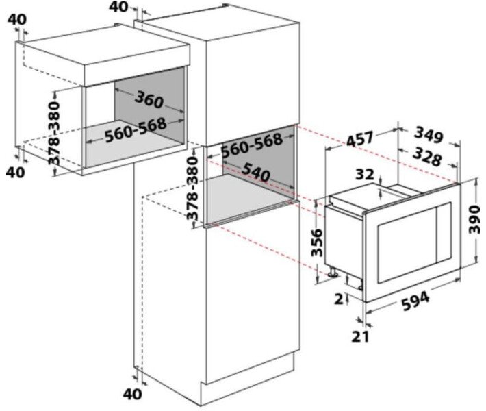 - Размеры монтажных отверстий: 37.8-38 x 56-56.8 x 36 см ,