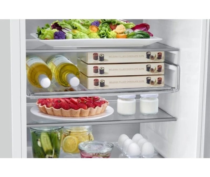 Підтримуйте оптимальну температуру всередині холодильника, щоб продукти залишалися свіжими, навіть якщо ви часто відкриваєте та закриваєте дверцята. Металева охолоджувальна панель, металева полиця та плоский металевий повітропровід утримують холод із повітря та допомагають відновити втрату тепла. Вони стильно виглядають і прості у чищенні.