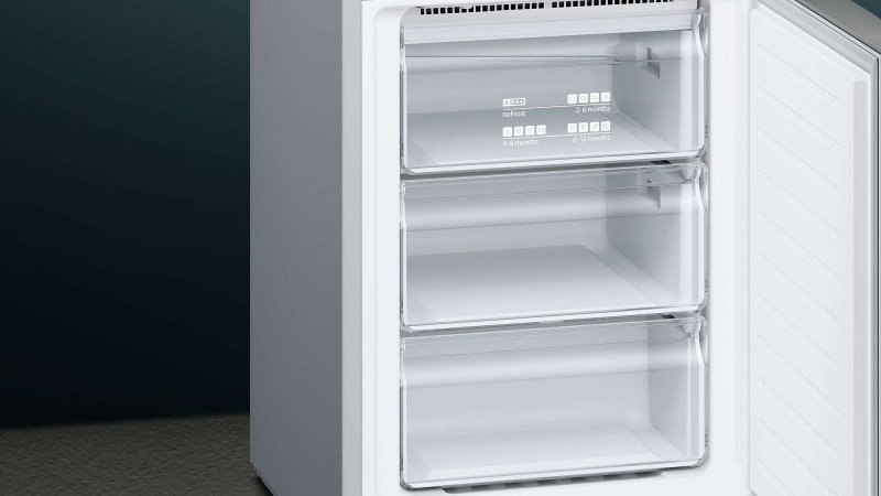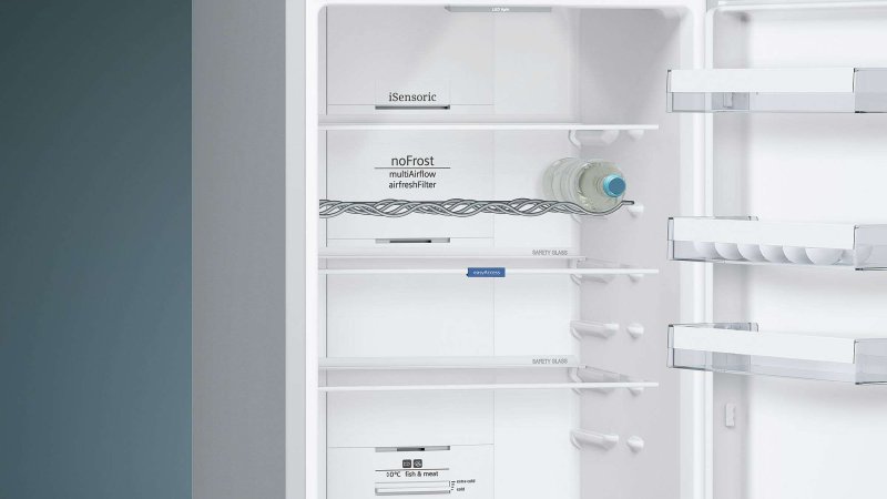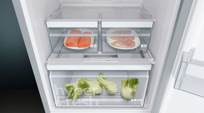 Ідеальне зберігання ваших продуктів. Холодильники з морозильною камерою Siemens забезпечать швидке охолодження та заморожування Ваших продуктів. Ідеальне зберігання овочів та фруктів. Температура в зоні свіжості HyperFresh 0°С нижча, ніж у холодильній камері, є оптимальною умовою для зберігання риби та м'яса. LED-освітлення. LED-лампи яскраво висвітлюють продукти всередині холодильника, забезпечуючи при цьому низьке споживання електроенергії протягом усього періоду експлуатації холодильника. Забудьте про розморожування назавжди. Завдяки технології noFrost лід усередині морозильної камери не намерзає, що позбавляє Вас процедури розморожування. Система MultiAirflow. Вона поступово розподіляє температуру по всьому холодильнику, забезпечуючи однакове охолодження продуктів на всіх полицях. Заморозьте продукти в мить. Запобігти розморожуванню старих продуктів під час завантаження нових допоможе функція «Суперзаморозка». Просто увімкніть її за добу до завантаження свіжих продуктів. За цей час температура в морозильній камері опуститься до -30 градусів і тим самим запобігатиме розморожуванню. Безпечне скло. Легкі та міцні: полички із загартованого скла safetyGlass неперевершено міцні та легко миються. А спеціальні борти гарантують, що рідини, що пролилися, не будуть протікати в інші відділення холодильника. Неперевершена енергоефективність. Клас енергоефективності приладу А++ що забезпечує високу продуктивність низьке споживання енергії.
